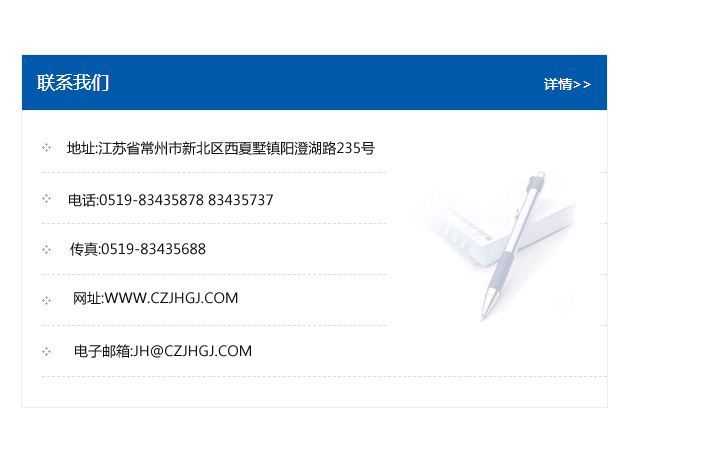 地址:常州市新北區友邦商務大廈1幢16、17層  電話:0519-85101652  傳真:0519-85112595  郵編:213022  網址:www_cz-jiayue_cn.zhuohong8.com  郵箱:xiajifengaa@163.com